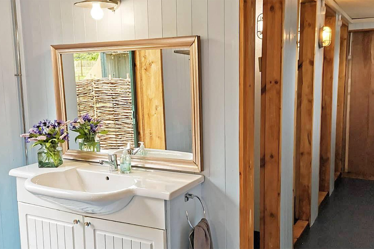 Two separate heated cabins resembling Shepherds huts, one with 4 individual Power showers cubicles and a dressing area and the second has 3 toilets with sink. Each have automatic lights and are well lit outside when it’s dark